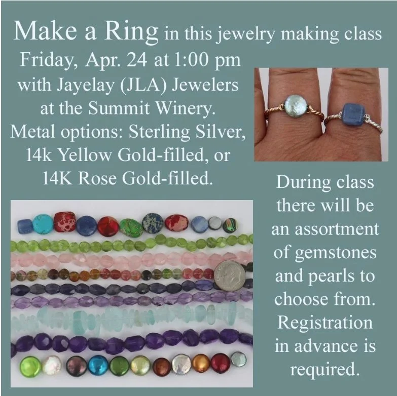 In this workshop you'll make a "Hand-Forged Ring". There will be a variety of pearls and gemstones to choose from. This is a beginner jewelry making class; you'll be working the metal is many ways: forming, hammering, center punching, filing, wrapping, and polishing. You are purchasing sterling silver; however, we will have 14k yellow gold-filled and 14k rose gold-filled materials available to upgrade to those options during class if you wish (there is a $20 upcharge for the gold option that can be paid during class). Individuals or small groups are welcomed. This class is led by Andrea Lorette of Jayelay (JLA) Jewelers at Rabbit Ridge Studios and the Summit Winery. Within this 2-hour class, Andrea will walk them step by step through the process of making this ring. Class size is 8 participants. All materials and tools are provided. This experience includes a beverage provided by the winery. Please bring reading glasses if you need help with seeing objects up close.